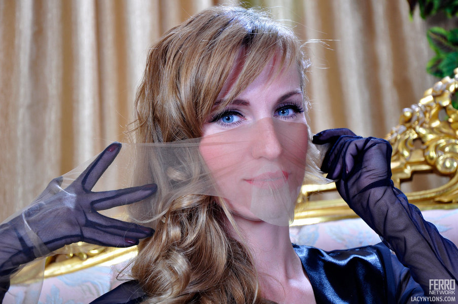 Gorgeous babe tries on retro style gloves with classy nylons and suspenders